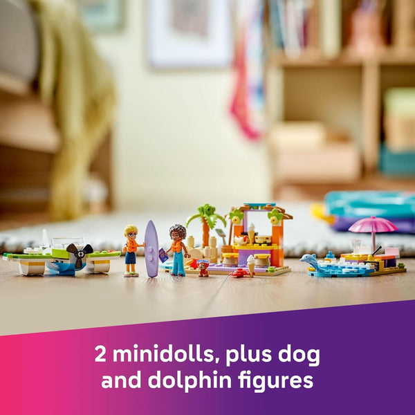 - Build, then rebuild – The set includes a beach scene with a seaplane, relaxation area and beach café hangout, which rebuilds into a new scene with a speedboat toy, an outdoor seating area and a pizza shop